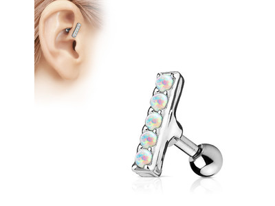 Микроштанга из хирургической стали 316L с кластером из пяти лабораторных опалов на родированной латунной основе.
