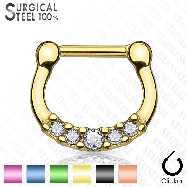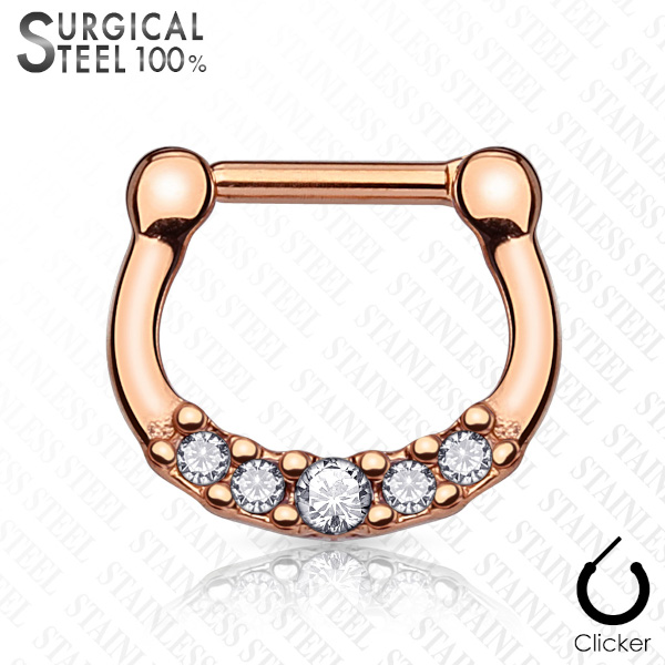Аккуратный кликер из хирургической стали 316L с IP покрытием. Украшен пятью стразами.