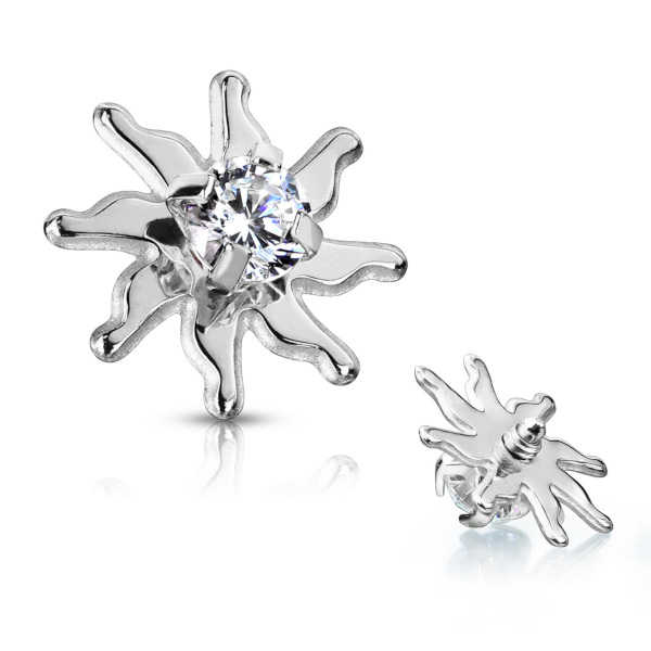 Накрутка в форме солнца для украшений толщиной 1,6мм с внутренней резьбой и микродермалов. Изготовлена из хирургической стали 316L, украшена стразом по центру. Представлен в трёх вариациях - полированный стальной, а также с чёрным и золотым IP покрытием.