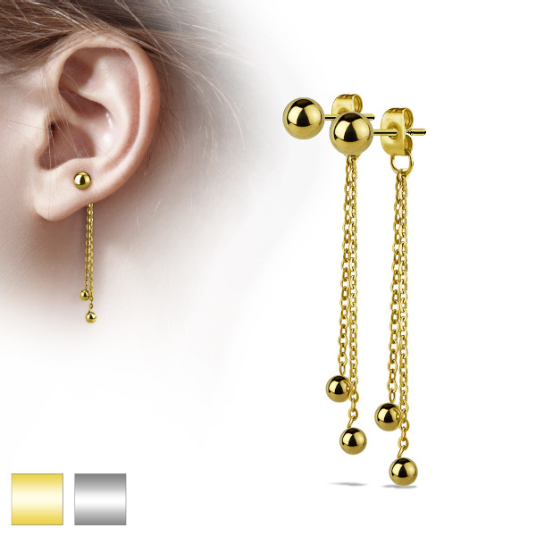 Серьги из хирургической стали 316L с цепочками и шариками. Декоративная часть выполнена из родированной латуни. Длина цепочек - 24 и 42 мм. Диаметры шариков 4 и 5мм. Представлен так же вариант с золотым IP покрытием.
