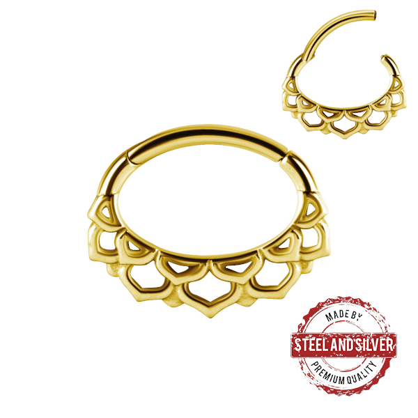 Кликер с изящным узором из хирургической стали 316L дополнен 24х каратным PVD покрытием.