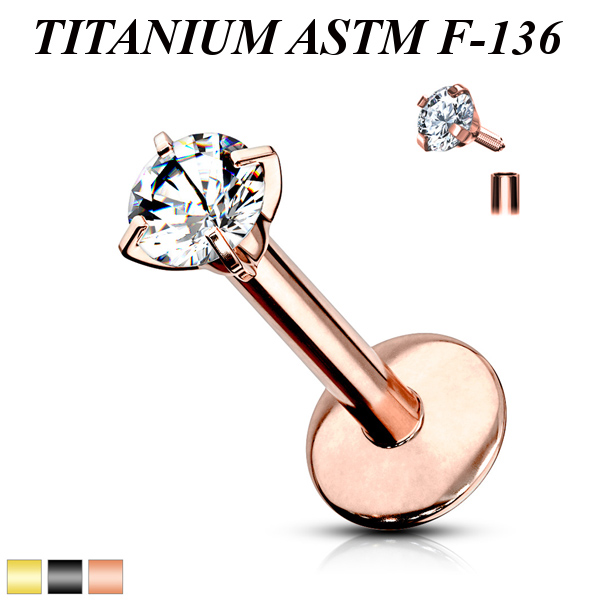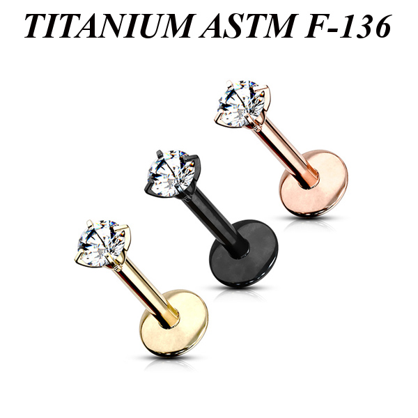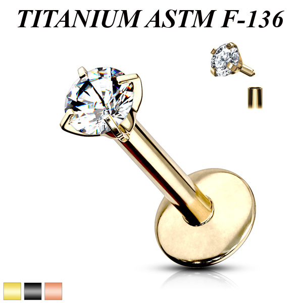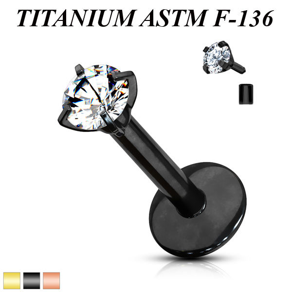 Лабрет с внутренней резьбой из имплантационного титана 6Al-4V-Eli ASTM: F-136 с PVD покрытием. Украшен прозрачным круглым фианитом в лапках.