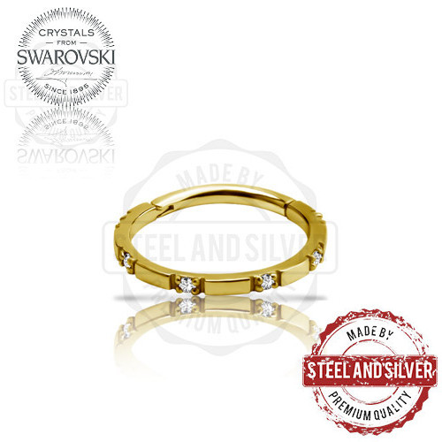 Кликер из хирургической стали 316L с 24х каратным золотым PVD покрытием. Украшен кристаллами Premium Cubic Zirconia.