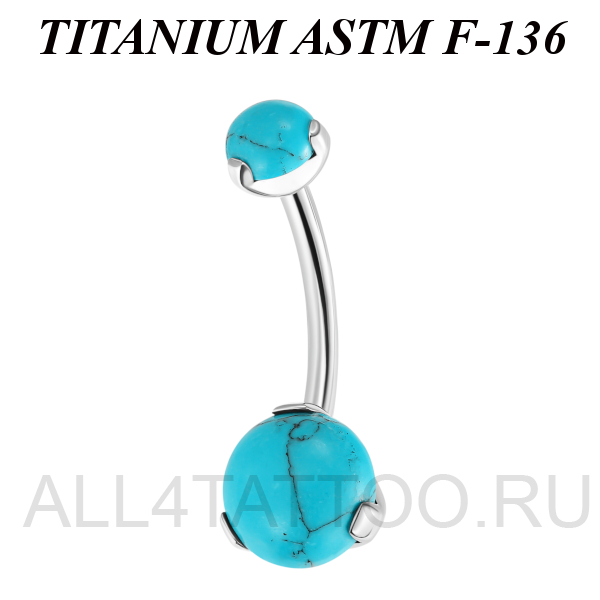 Банан из имплантационного титана 6Al-4V-Eli ASTM: F-136 с внутренней резьбой. Украшен кабошоном из искусственной бирюзы.