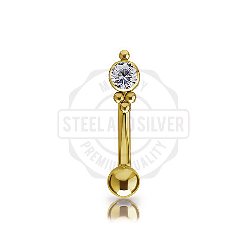 Микробанан с внутренней резьбой из имплантационного титана 6Al-4V-Eli ASTM: F-136 с PVD покрытием 24х каратного золота. Украшен кластером высотой 5.5мм c кристаллом Premium Zirconia.
