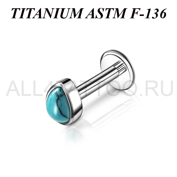 Лабрет из имплантационного титана 6Al-4V-Eli ASTM: F-136 с накруткой в форме капли, украшенной искусственной бирюзой. Внутренняя резьба.