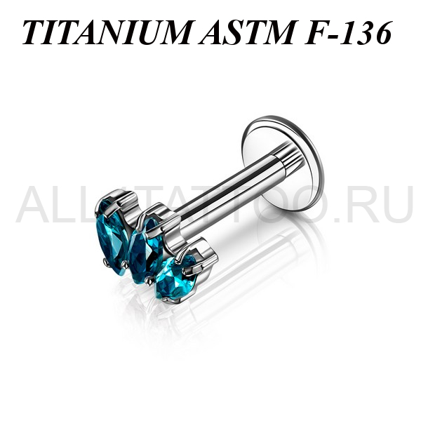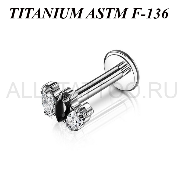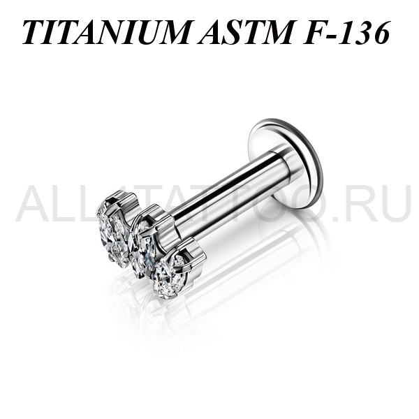 Лабрет с внутренней резьбой из имплантационного титана 6Al-4V-Eli ASTM: F-136. Украшен накруткой с тремя фианитами огранки "маркиз".