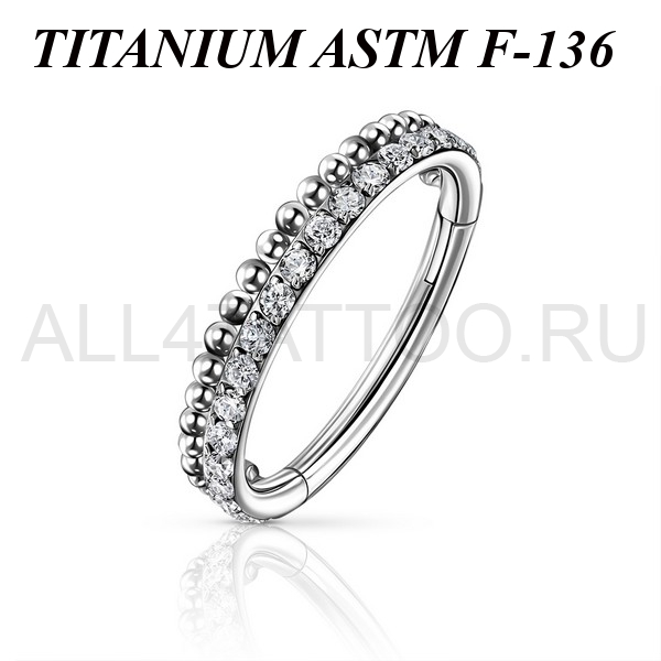 Изящный кликер из имплантационного титана 6Al-4V-Eli ASTM: F-136. Украшен множеством прозрачных фианитов и дополнительным рядом миниатюрных шариков.