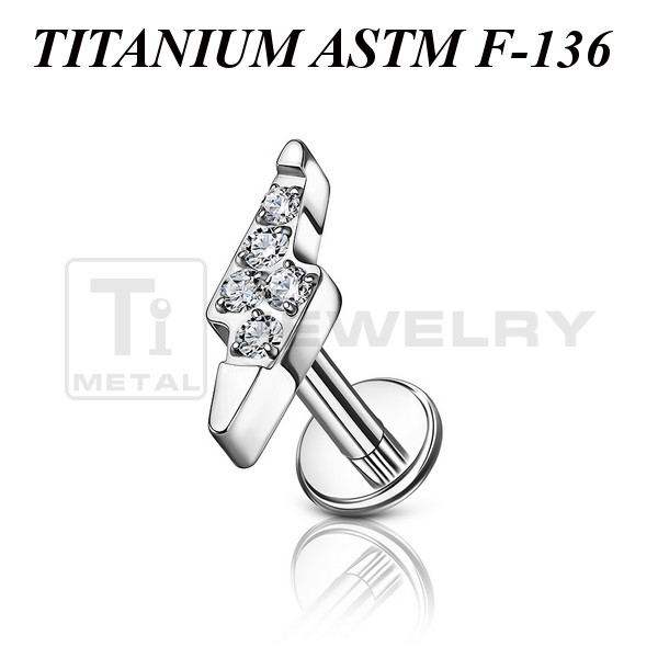Лабрет из имплантационного титана 6Al-4V-Eli ASTM: F-136 с внутренней резьбой. Украшен накруткой в форме молнии с пятью прозрачными кристаллами . Размер декоративной части: 3х8,5мм.