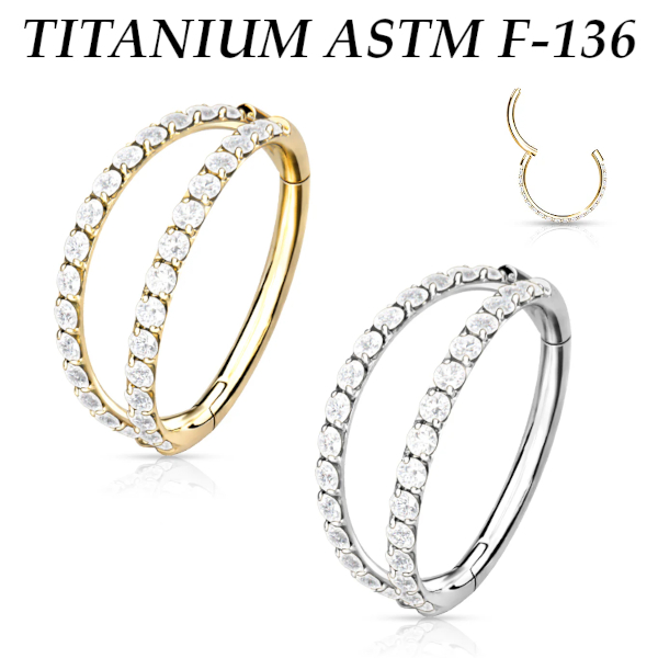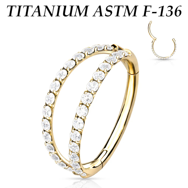 Кликер из имплантационного титана 6Al-4V-Eli ASTM: F-136 с двумя дугами, украшенными миниатюрными прозрачными фианитами. Представлен в двух вариантах: классический титановый и с золотым PVD покрытием.