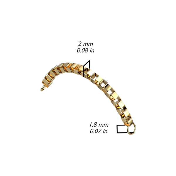 Цепочка для пирсинга из хирургической стали 316L. Представлена в двух вариантах: классическом стальном и золотым PVD покрытием. Подходит для украшений толщиной не более 1,6мм.