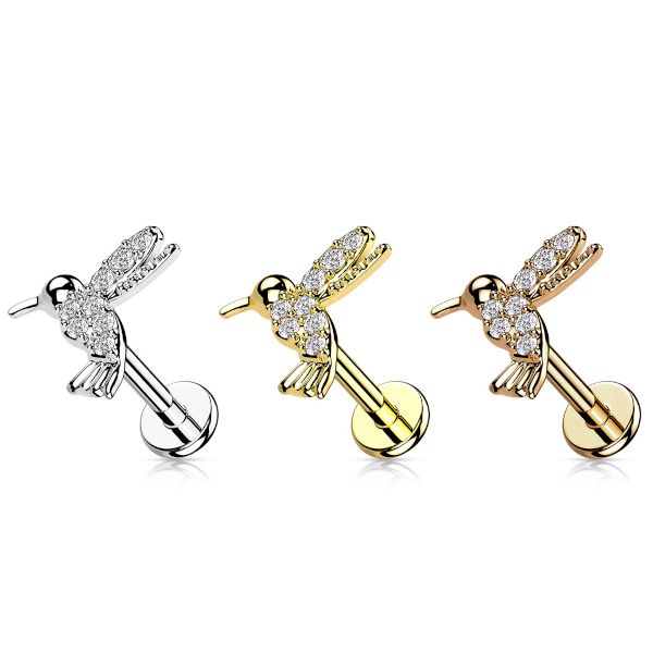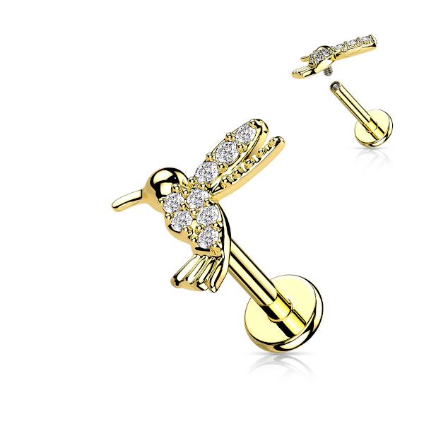 Лабрет из хирургической стали 316L с внутренней резьбой. Представлен в двух вариантах: классический стальной и с PVD покрытием жёлтого золота. Накрутка из родированной латуни, украшена фианитами. Размер накрутки: 9х8,5мм.