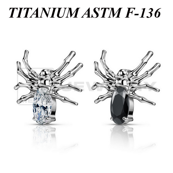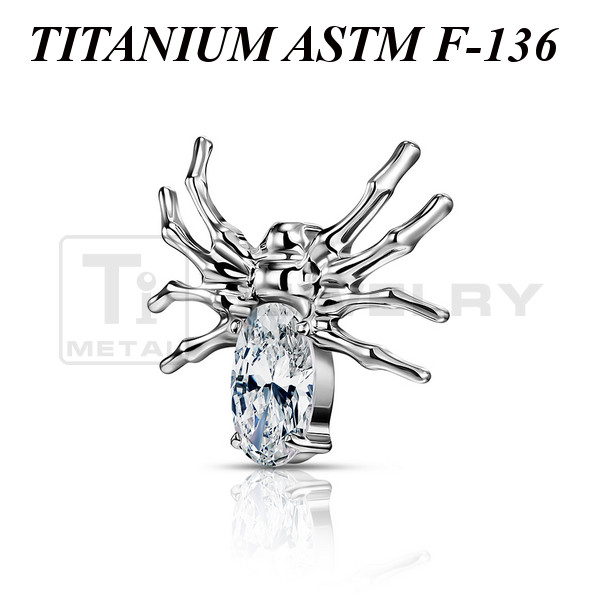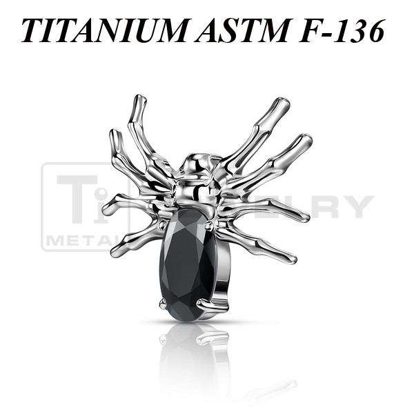 Фигурная накрутка из имплантационного титана 6Al-4V-Eli ASTM: F-136 в форме паука. Украшена фианитом. Размер накрутки: 10х10,7мм. Подходит для украшений с внутренней резьбой толщиной 1 и 1,2 мм.