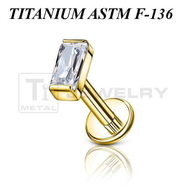 Лабрет с внутренней резьбой из имплантационного титана 6Al-4V-Eli ASTM: F-136 с золотым PVD покрытием. Украшен накруткой с прозрачным фианитом. Размер накрутки: 2х4,5мм.