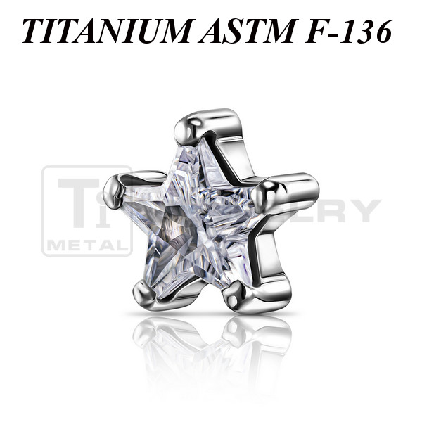 Накрутка из имплантационного титана 6Al-4V-Eli ASTM: F-136 с фианитом в форме звёздочки, закреплённом в лапках. Подходит для украшений с внутренней резьбой толщиной 1 и 1,2 мм.