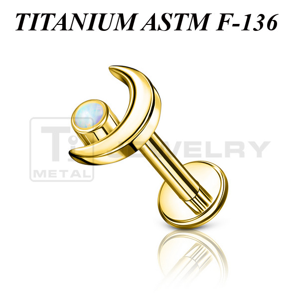 Лабрет из имплантационного титана 6Al-4V-Eli ASTM: F-136. Представлен в двух вариантах: классический титановый и с золотым PVD покрытием. Украшен накруткой в форме полумесяца с синтетическим опалом. Размер накрутки: 6х4мм.