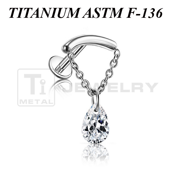 Лабрет из имплантационного титана 6Al-4V-Eli ASTM: F-136. Украшен фианитом в форме капли на цепочке. Размер декоративной части: 10х15,5мм.