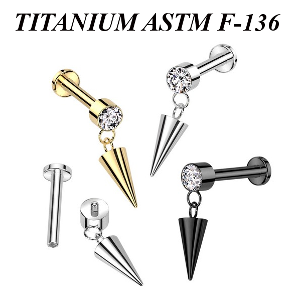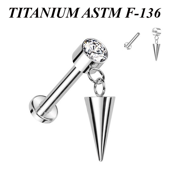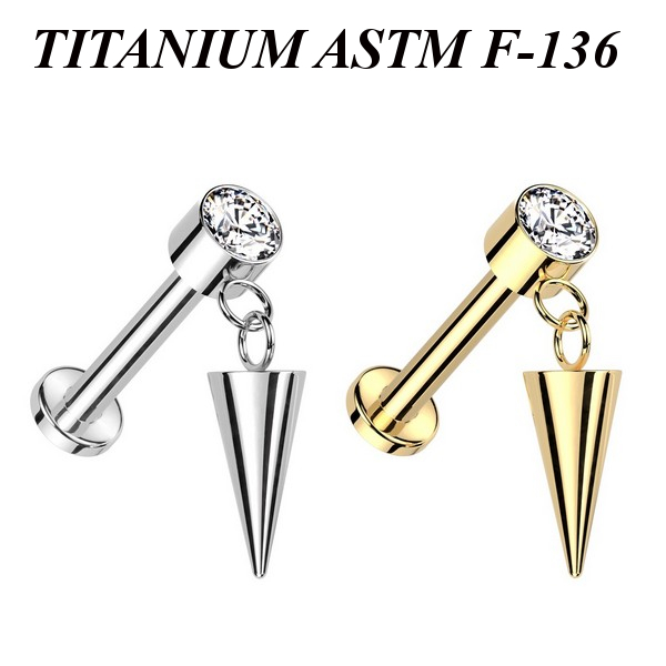 Лабрет с внутренней резьбой из имплантационного титана 6Al-4V-Eli ASTM: F-136. Представлен в двух вариантах: классический титановый и с золотым PVD покрытием. Украшен накруткой с прозрачным фианитом и фигурной подвеской в форме пики.