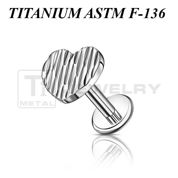 Лабрет из имплантационного титана 6Al-4V-Eli ASTM: F-136 с внутренней резьбой. С накруткой в форме сердца с рельефной поверхностью. Размер накрутки: 5,6х5мм.