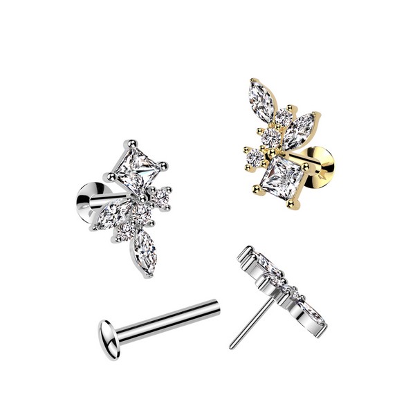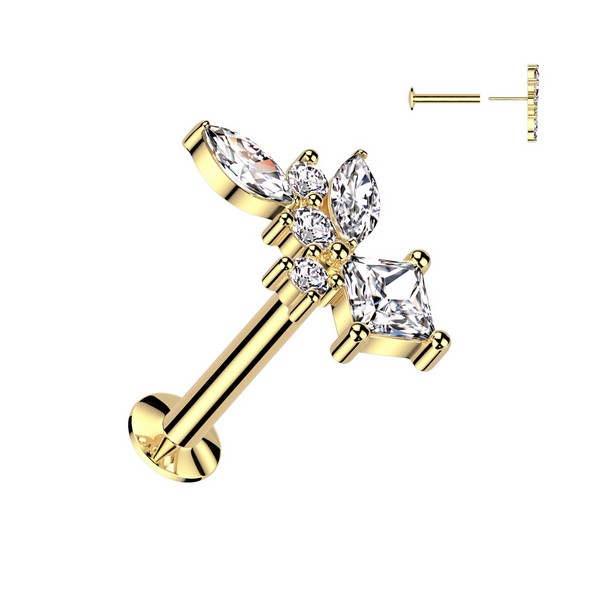 Безрезьбовой лабрет из хирургической стали 316L с декоративной частью из родированной латуни. Украшен фианитами. Представлен в двух вариантах: классический стальной и с золотым PVD покрытием.